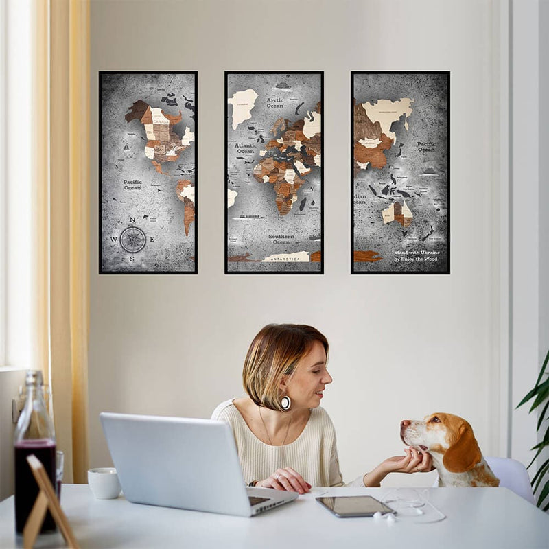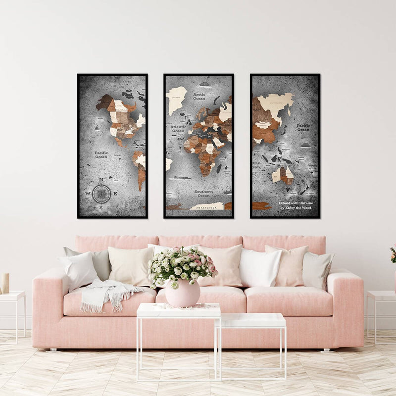 Dank der sechs verfügbaren Hintergrundfarben – Vintage, Dark, Concrete, Ocean, Space und Oil Painting – schmückt diese Karte in Form eines Triptychons selbst die langweiligste Wand! Ob Sie nun ein Kinderzimmer, ein Wohnzimmer, ein Schlafzimmer oder ein Arbeitszimmer dekorieren möchten – die gerahmte und auf einer Platte vorinstallierte Wandkunst Triptych wird zum Mittelpunkt jedes Raumes. Von industriell und minimalistisch bis natürlich und modern – die Art der Einrichtung spielt keine Rolle, denn die Holzkarte passt zu jeder Farbpalette und jedem Stil.