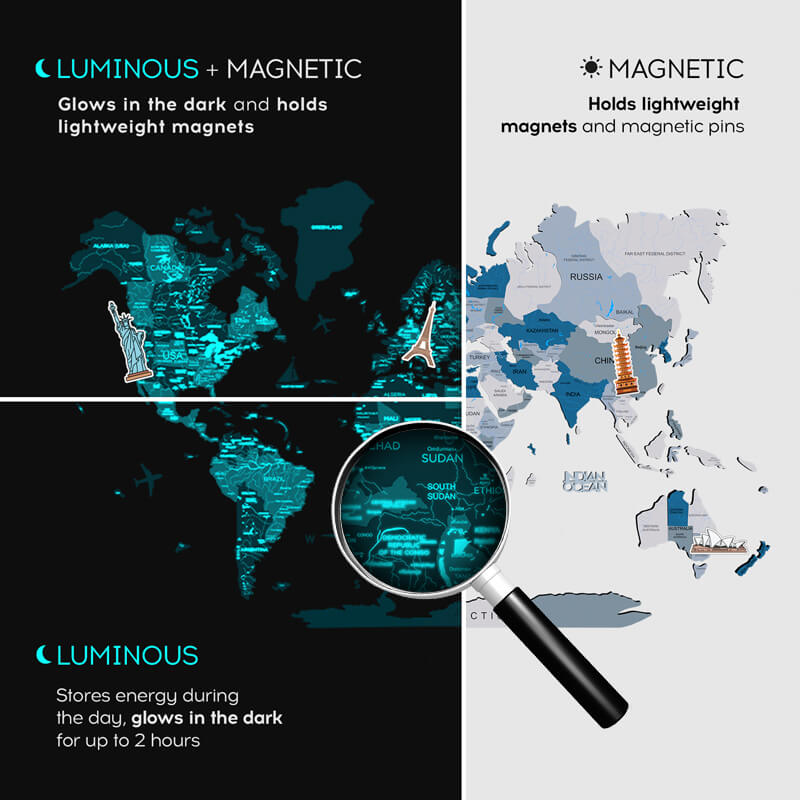 Die leuchtende Karte ist eine interaktive, ansprechende und unterhaltsame Möglichkeit, sich an vergangene Reisen zu erinnern und zukünftige Abenteuer zu planen. Beide Möglichkeiten sind ideal, um einige lebenslange Erinnerungen zu schaffen.