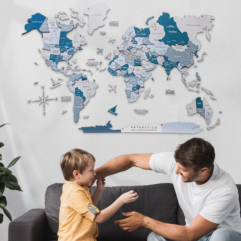 Die Karte ist kein geografisches Hilfsmittel, da einige kleine Inseln und Städte weggelassen wurden. Sie können jedoch gemeinsam mit Ihren Kindern Orte markieren, die Sie gerne besuchen würden oder bereits besucht haben. Oder entdecken Sie einfach, wie groß die Welt ist, und fördern Sie bei kleinen Kindern die Wanderlust und die Liebe zur Geografie.